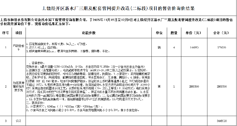 上饒國屬工程造價咨詢有限公司受上饒市和濟水務有限公司的委托,根據上饒市和濟水務有限公司的招標計劃,遵循公平、公正、公開、誠信原則,對上饒市和濟水務有限公司的哈夫節(jié)采購項目進行公開詢價,誠邀相關供應商對采購單位所需服務進行報價。一、招標需求1.項目名稱:哈夫節(jié)采購項目2.項目要求:詳見附件二、報價要求1、供... [更多]