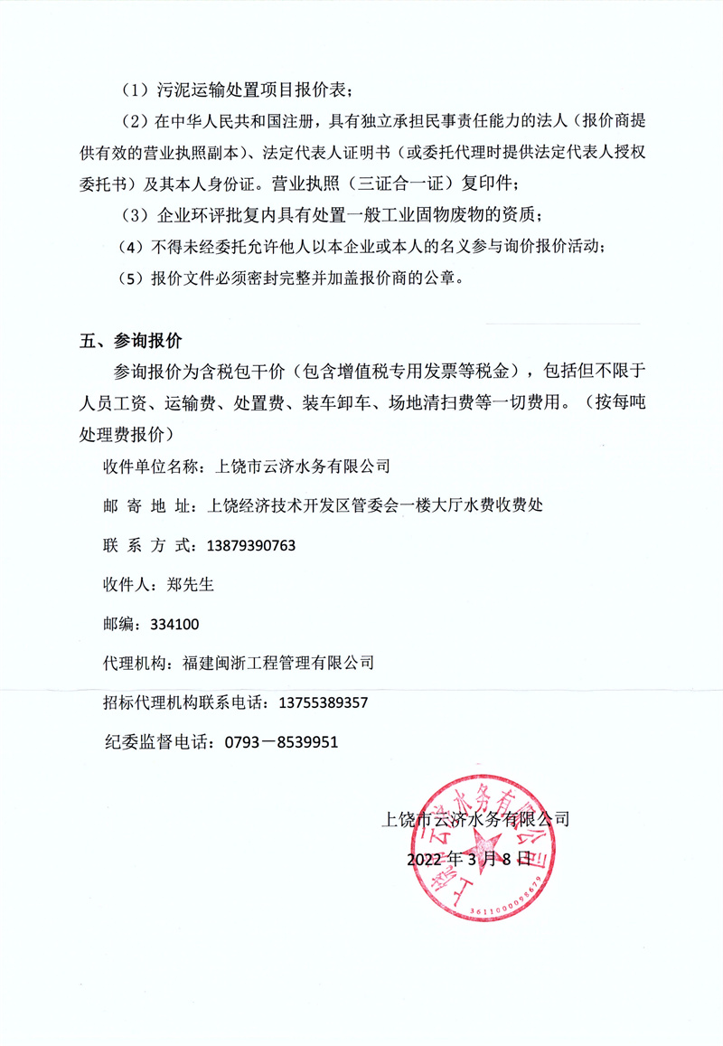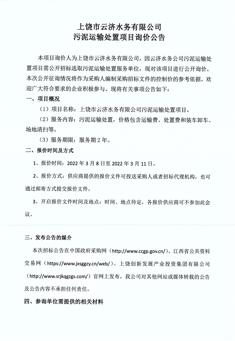上饒市云濟(jì)水務(wù)有限公司污泥運(yùn)輸處置項(xiàng)目詢(xún)價(jià)公告